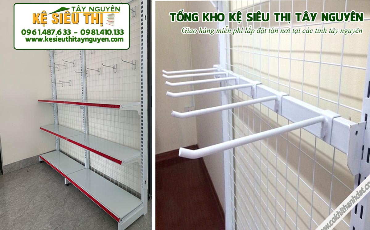 – kệ móc treo đôi 0.7, 0.9, 1.2 m x 1,2m – 1,8m giúp tận dụng được tối đa không gian để trưng bầy hàng hàng hóa